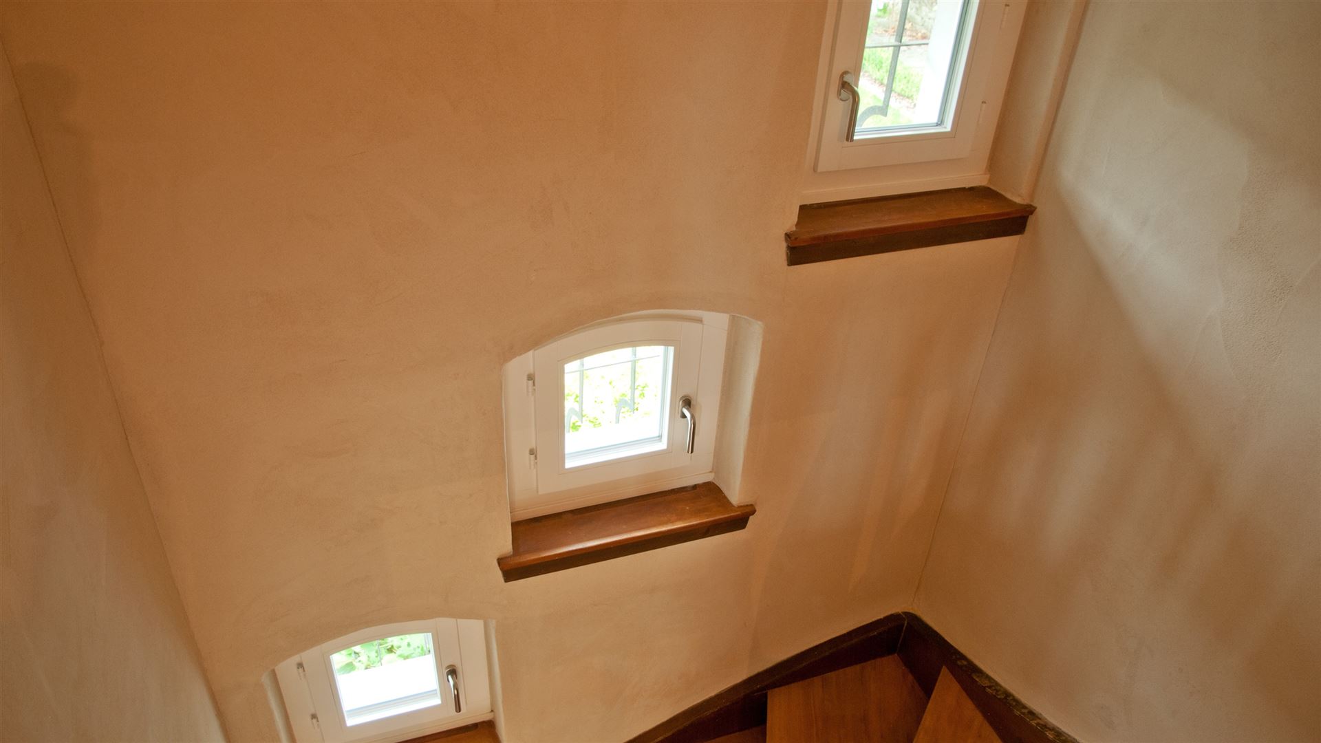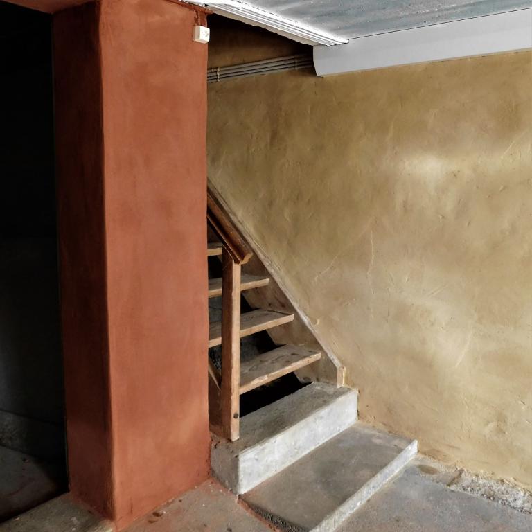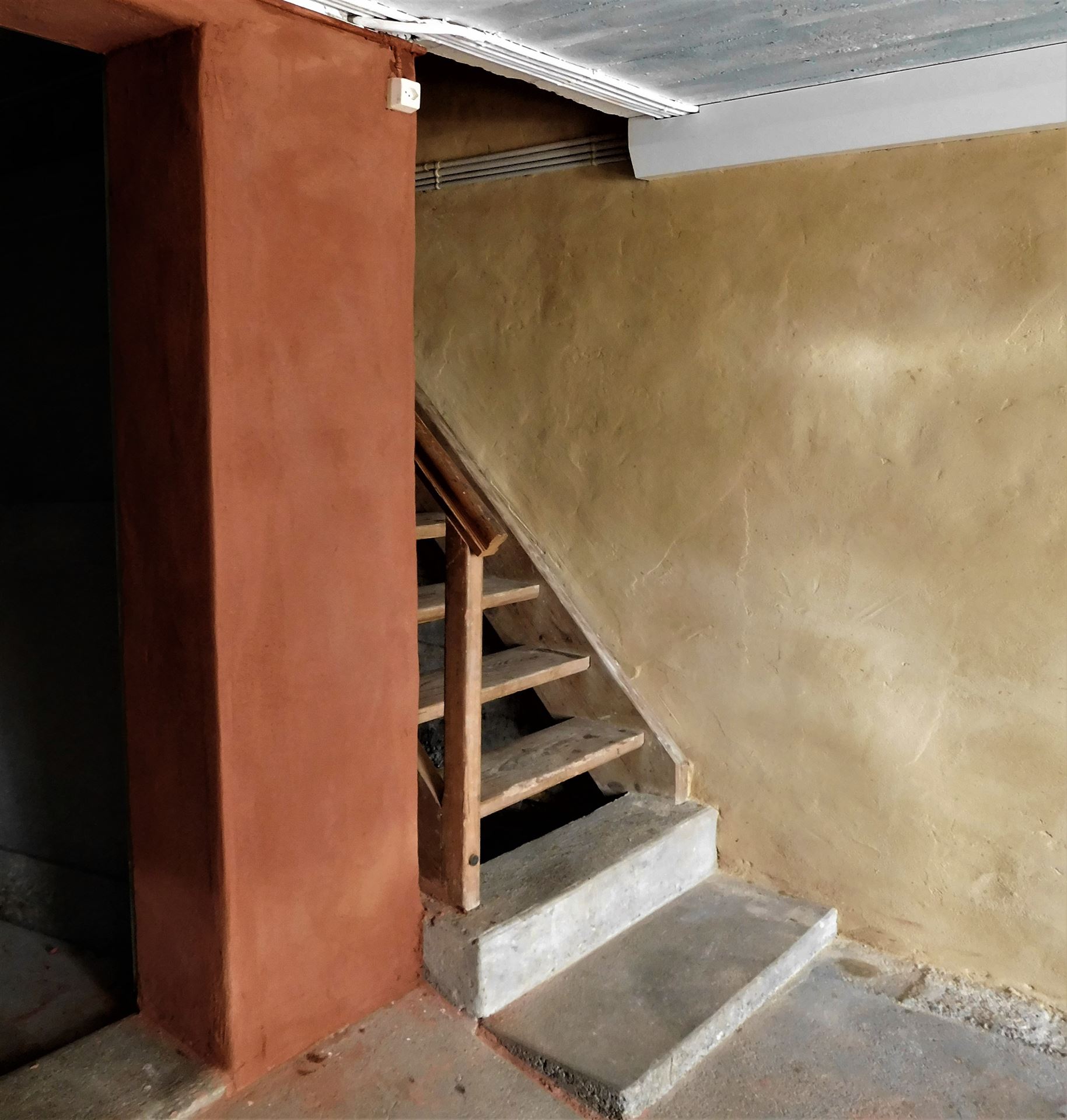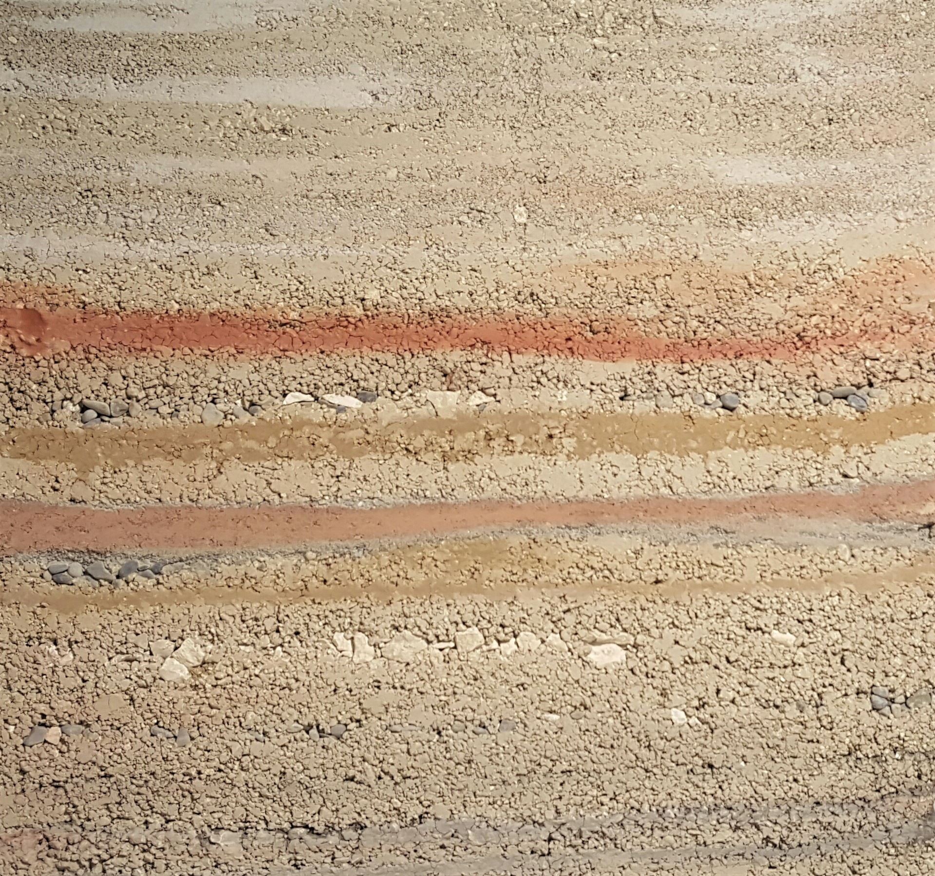 Lage für Lage wurde verschiedenfarbiger Lehm vor Ort in eine Schalung gestampft, Intuition und das Vorbild der Umgebung als alleinige Berater. Das Ergebnis ist das einzigartige Zusammenspiel von rotem, gelbem, weissem und grauem Lehm.